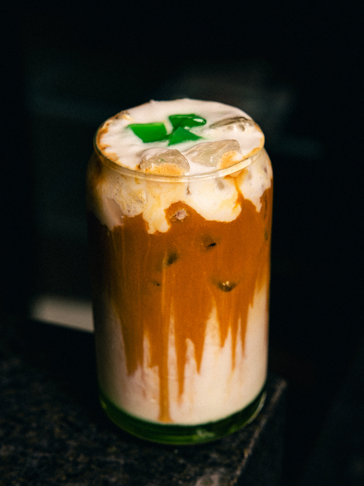 An MG Signature Drink! A mix of housemade pandan syrup, coconut cream, coco jelly, and espresso. Iced only. Come try one out yourself. You won't be disappointed.